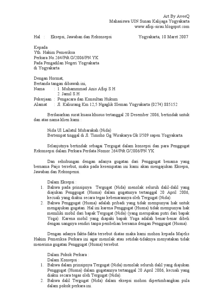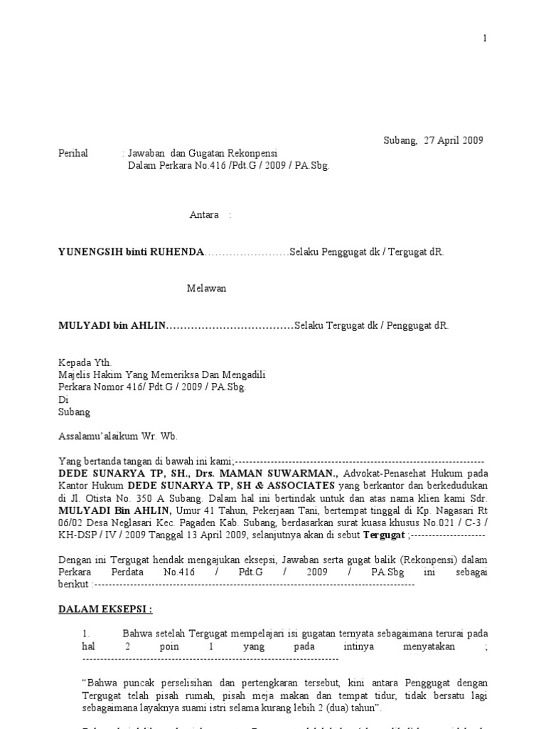 Contoh surat gugatan wanprestasi dalam hukum acara perdata. Contoh surat jawaban atas gugatan untuk berbagai perkara hukum yang dapat diunduh secara lengkap dan gratis tanpa perlu daftar. Jawaban dan eksepsi tergugat i. Eksepsi (exceptio) mempunyai arti pengecualian. Menteri hukum dan hak asasi manusia republik indo nesia cq.